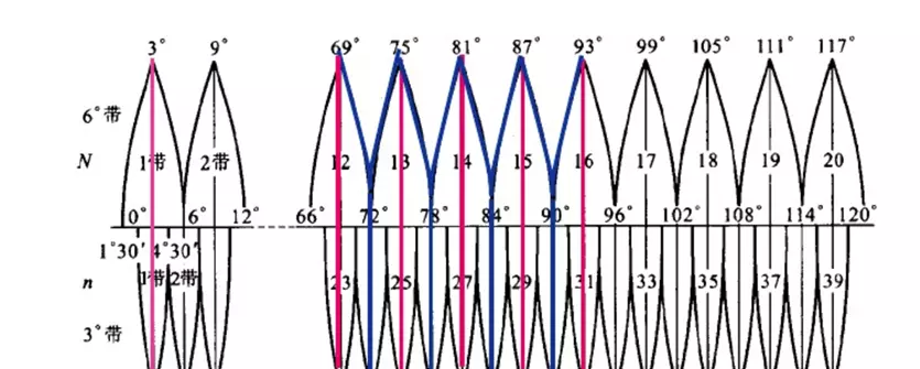 三度带是在六度带的基础上分成的他的中央子午线有一半与六度带的中央子午线重合,即自1.5度起每隔3度自西向东分带,代号依次为第1、2...120带。
