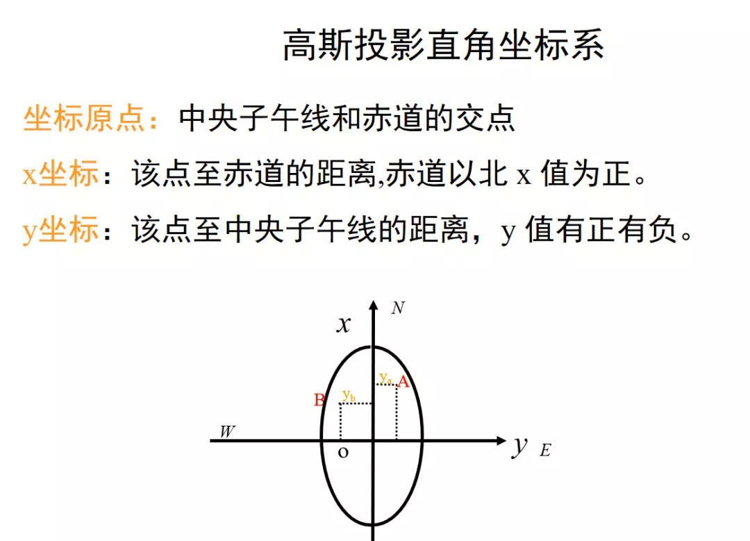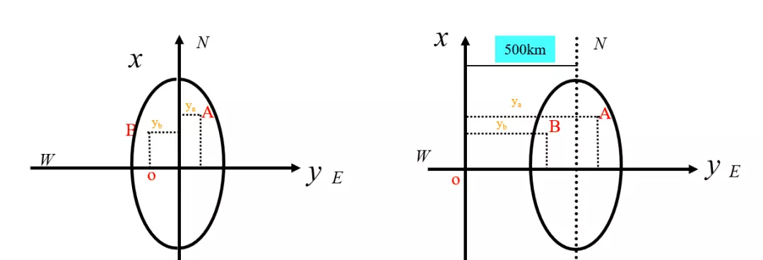 这里必须提醒一下:测量坐标系(如上图)中X方向是北方向,Y方向是东方向,这点和数学坐标系中是有区别的。由于我国位于北半球,所有的X都是正值,Y坐标是有正有负的,为了避免y坐标值出现负值,我国规定将每带的坐标原点向西移500km(这样XY都是正值,便于计算)。由于各投影带上的坐标系是采用相对独立的高斯平面直角坐标系,为了能正确区分某点所处投影带的位置,规定在横坐标值前面冠以投影带带号。