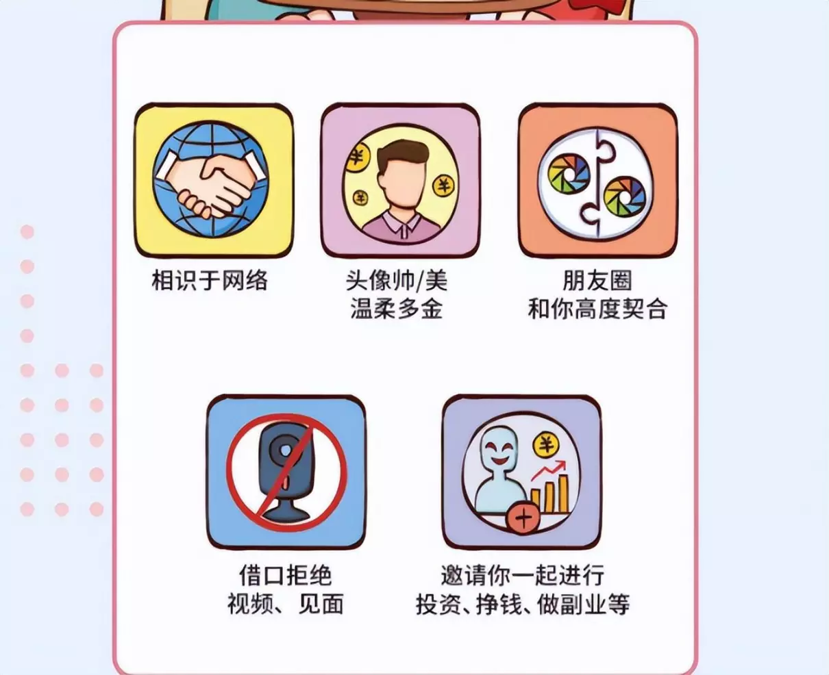 1、网络交友需谨慎,天降馅饼即陷阱。不要轻易相信一些人的花言巧语,“给你甜甜的恋爱”“跟着我稳赚不赔”不可信,涉及钱财、个人信息等敏感事项,应谨慎作出决定,不给任何犯罪分子可乘之机。
