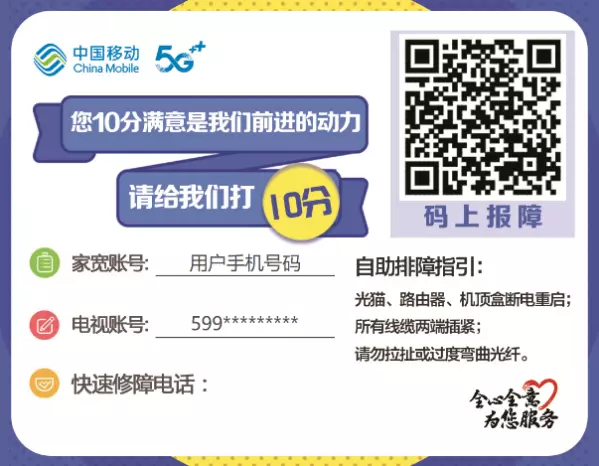 广州移动设置了1008616宽带服务专线,致力于为用户提供一站接入全程无忧的服务体验。通过拨打该服务专线,用户申请报装移动宽带,实现足不出户宽带到家。成功安装后,装维小哥还会细心的贴好温馨提示便签,遇到网络使用问题,扫描便笺上的二维码即可完成自助排障及报障,也可拨打1008616人工报障,省时省力快速定位网络问题。