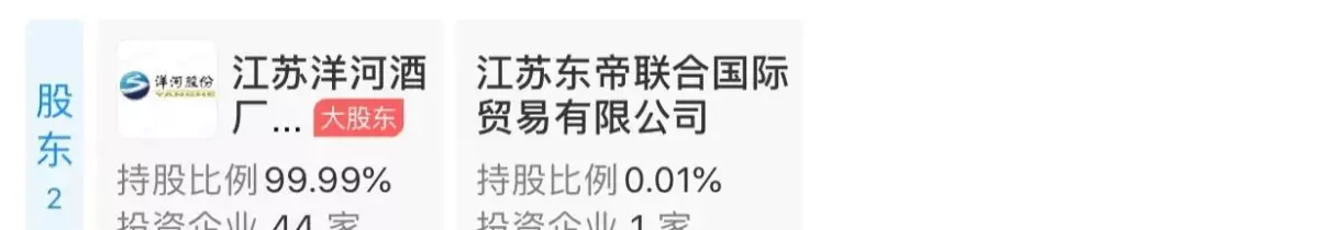 按照现实现的控股比例,洋河股份高达99.99%,另0.01%由洋河股份的另一家子公司——江苏东帝联合贸易公司持股。