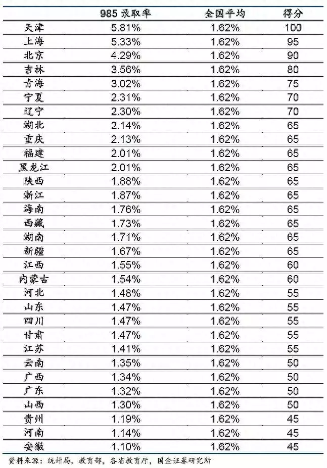 下面是全国各省市985大学的录取比例排行榜。我们可以看到,录取比例最高的不是北京,而是天津,这也就是为什么这几年高考移民都想去天津的原因。