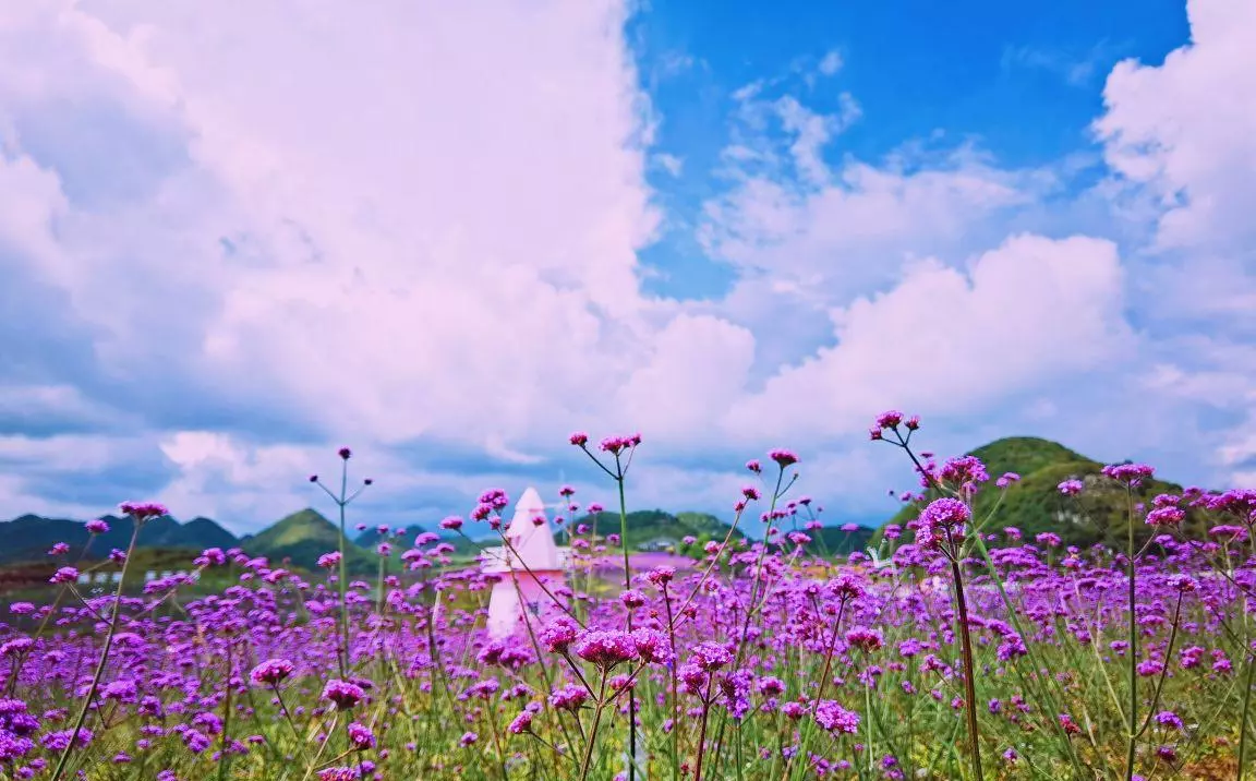从市区出发一个多小时,可以看到野鸡坪星空花海上万亩马鞭草汇成一片紫色海洋,紫色的花海随风飘荡,伴随着马鞭草的馥郁芬芳,犹如进入美轮美奂的梦境。