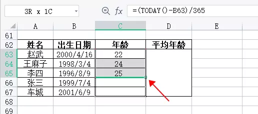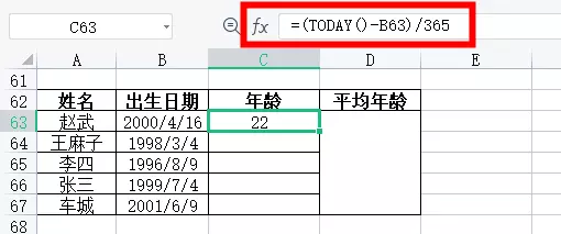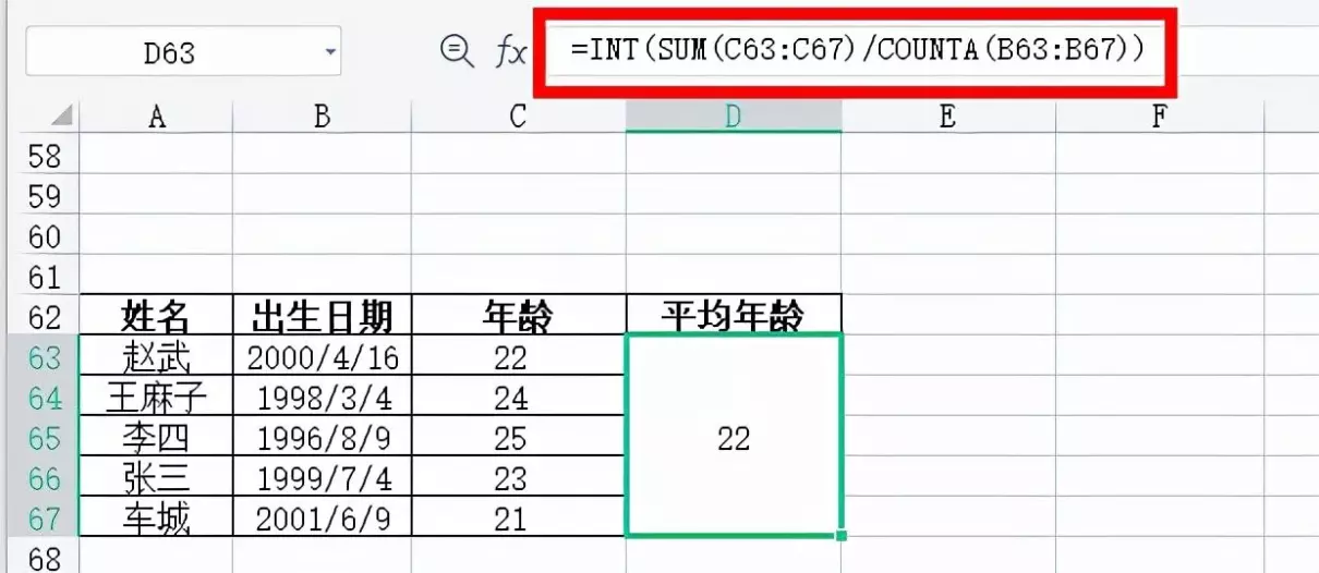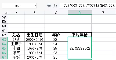 公式解析:SUM(C63:C67)是将计算出的年龄相加,COUNTA(B63:B67)是统计区域中的非空单元格个数等同于人数。