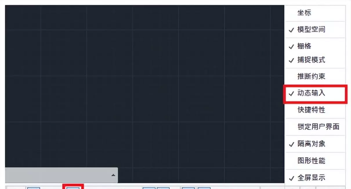 然后将动态输入前面的对勾添加上之后,在最下面的动态栏里面就会看到它的图标就显示了出来。