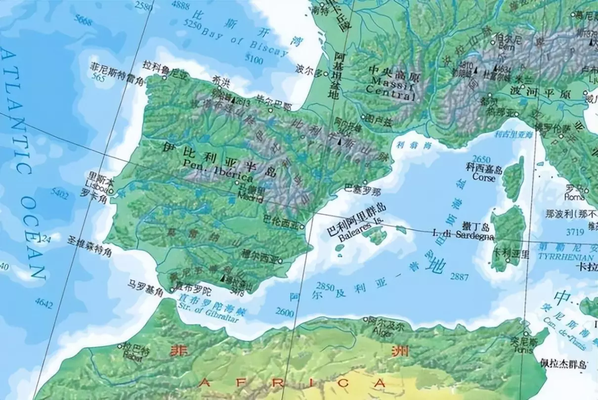 西班牙中部平均海拔600米到800米的梅塞塔高原约占西班牙国土面积的60%。西班牙海拔200以下的平原地区大约只占国土面积的11%;海拔201米至600米的地区占国土面积31%;海拔601米至1000米的地区占国土面积的39%;海拔1001米至2000米的地区占国土面积的18%;海拔2000米以上的地区占国土面积的1%。意大利的平原面积则相对更多:意大利北部的波河平原面积约4.6万平方公里、平均海拔100米。