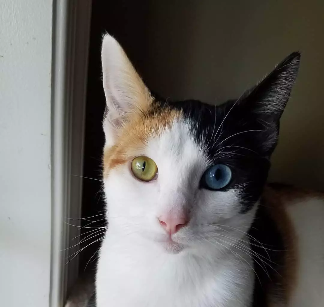 另外,虹膜异色症也有许多表现类型,有双眼异色,也有单眼异色,其中单眼异色又能分为环瞳异色、放射异色、中分异色、扇形异色等。单眼异色指的是一只猫咪它的一只眼睛中有着两种或多种不同颜色,看上去充满了妖媚的神秘气质,比双眼异色的猫咪更有特色,下面这只猫咪就是中分型虹膜异色,它的每一只眼睛都有蓝色和黄色两种颜色!