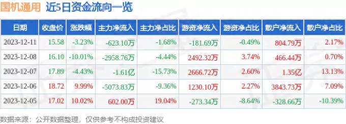 12月11日的资金流向数据方面,主力资金净流出623.1万元,占总成交额1.68%,游资资金净流出181.69万元,占总成交额0.49%,散户资金净流入804.79万元,占总成交额2.17%。