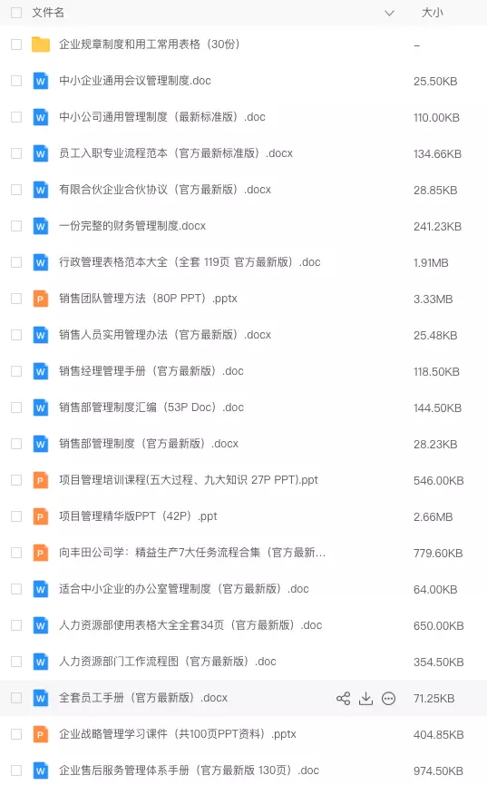 全套资料工具箱从办公室日常规范、财务管理制度、采购管理制度、经营管理、项目管理、行政管理、人力资源管理、生产管理、仓储管理、质量管理、营销管理、信息化管理等多个板块,感兴趣可以去首页了解。