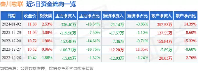 1月2日的资金流向数据方面,主力资金净流出336.4万元,占总成交额13.54%,游资资金净流出21.14万元,占总成交额0.85%,散户资金净流入357.53万元,占总成交额14.39%。