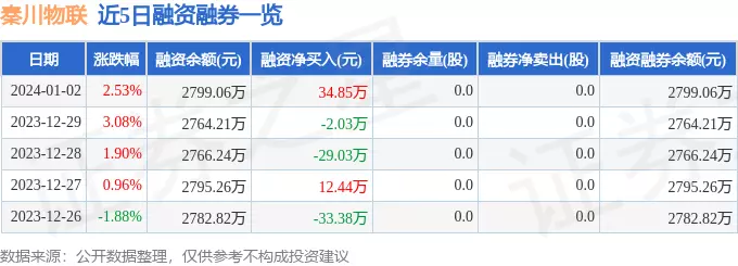 秦川物联融资融券信息显示,融资方面,当日融资买入100.96万元,融资偿还66.12万元,融资净买入34.85万元。融券方面,融券卖出0.0股,融券偿还0.0股,融券余量0.0股,融券余额0.0万元。融资融券余额2799.06万元。近5日融资融券数据一览见下表: