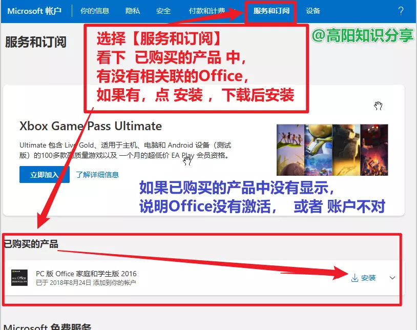 另外,除了电脑本身的显示外,在微软官网也会有相关显示。因为激活Office用的是微软Microsoft账户,所以登录微软官网。