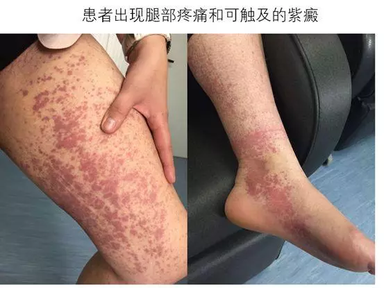 在开始乌司奴单抗治疗三年后,患者下腹部和双腿出现疼痛和明显的紫癜(见下图)