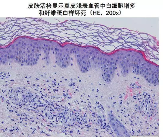 进行皮肤活检,病理检查结果显示:粒细胞性皮炎,皮肤小血管壁中存在纤维蛋白样物质(见下图)。