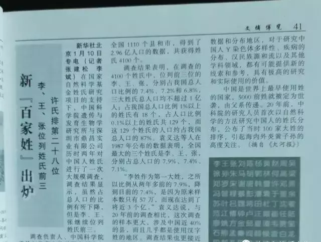 二是我们又认真梳理了《许氏文化》报、刊,从2001年来先后刊登过的许姓人口在百家姓排序的有关报道,说明了许姓人口总数及在百家姓中排序的变化。