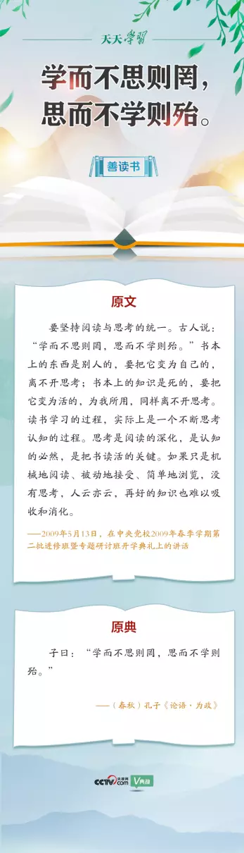 阅读与思考是相辅相成的。只读书而不思考,如同囫囵吞枣。习近平总书记指出:“书本上的东西是别人的,要把它变为自己的,离不开思考;书本上的知识是死的,要把它变为活的,为我所用,同样离不开思考。读书学习的过程,实际上是一个不断思考认知的过程。思考是阅读的深化,是认知的必然,是把书读活的关键。”同时,读书是思考之源。总书记强调:“思考的基础是阅读。终日而思,不如须臾之所学。只有通过阅读获得新知识、了解新思想、树立新观念,才能提高思维的准确性、逻辑性、深刻性、敏捷性、创造性。”他提醒领导干部要同时防止学而不思和思而不学这两种现象。