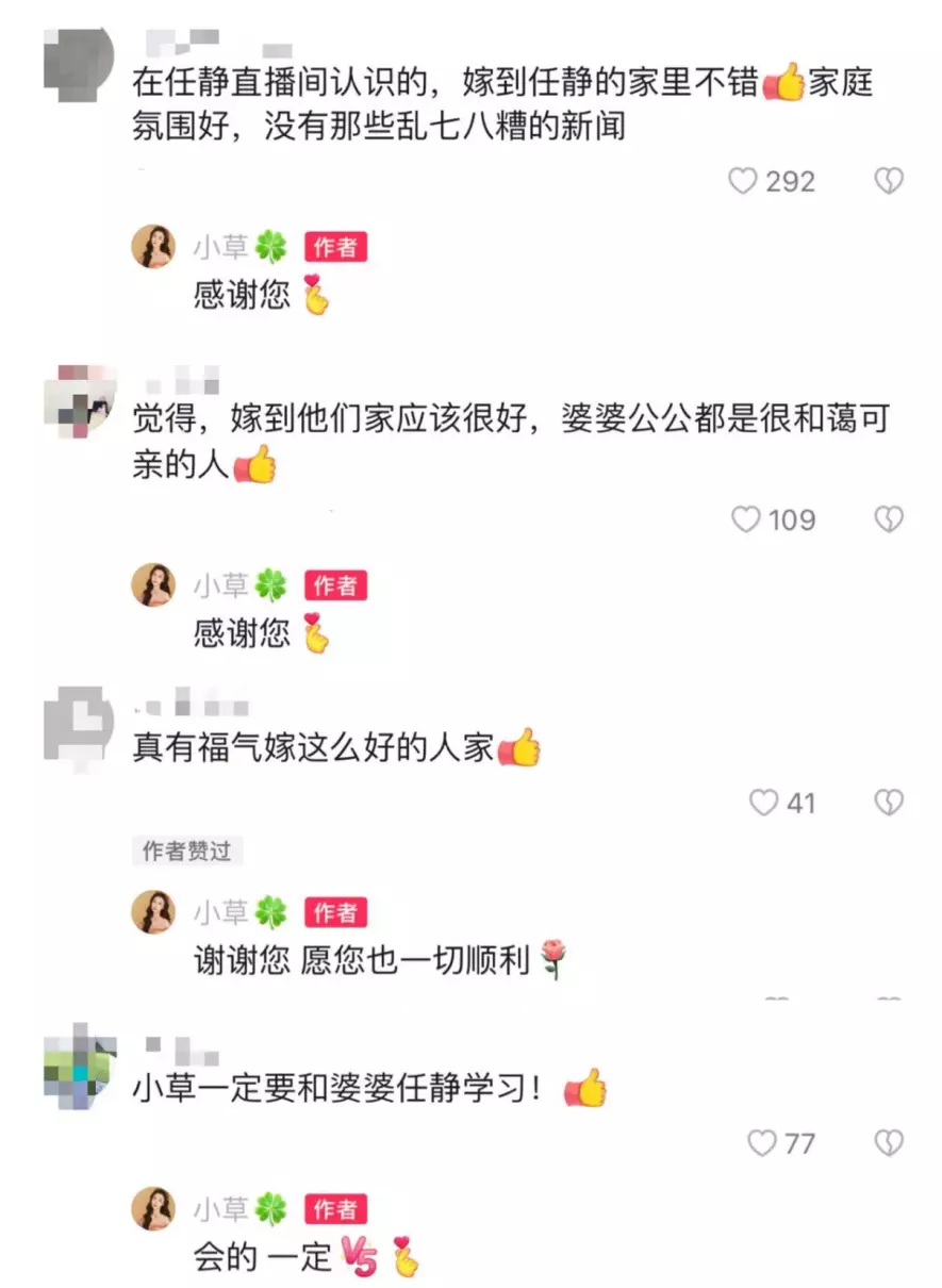 视频曝光后,网友们议论纷纷,有人夸任静漂亮又年轻,和胡樱子同框像姐妹一般。另外,还有网友询问为什么突然带着胡樱子一块直播,对此有知情的网友透露,胡樱子是付笛生儿子付豪的媳妇,公公、婆婆带着媳妇出镜非常正常。