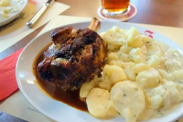 伯尔尼属于瑞士德语区,饮食也很有德国特色。比如德国最有名的烤猪肘和大香肠。为解猪肘的腻,一般食客会搭配蔬菜沙拉、黄芥末、酸菜一起吃。而常见的德式的大香肠在伯尔尼老街上随处可见,香肠小吃摊前永远排着长队,餐厅里也是必点菜肴。