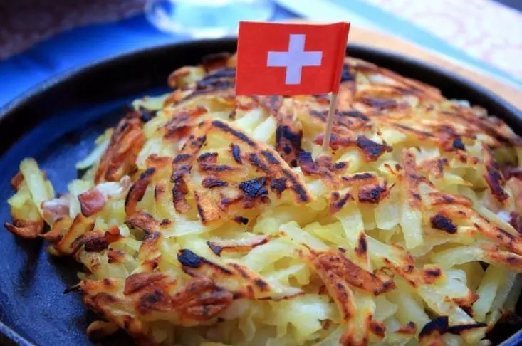 土豆饼(Roesti)是当地的一种经典小吃,也是餐厅里最常见的主食。搭配土豆饼的配菜也非常讲究,比如配酸菜,猪肘,小牛肉……土豆的脆,奶酪的香,肉的多汁,是最完美的搭配。