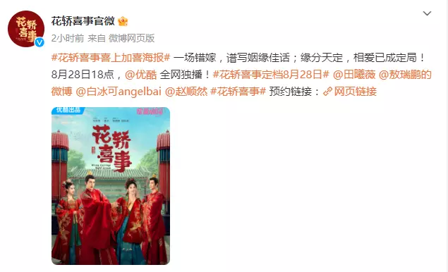 网友看到《花桥喜事》的预告片后表示:“婚服造型很走心啊,期待!”“田曦薇太甜了,不知能不能演绎出李玉湖武将世家出身的那种英气”。