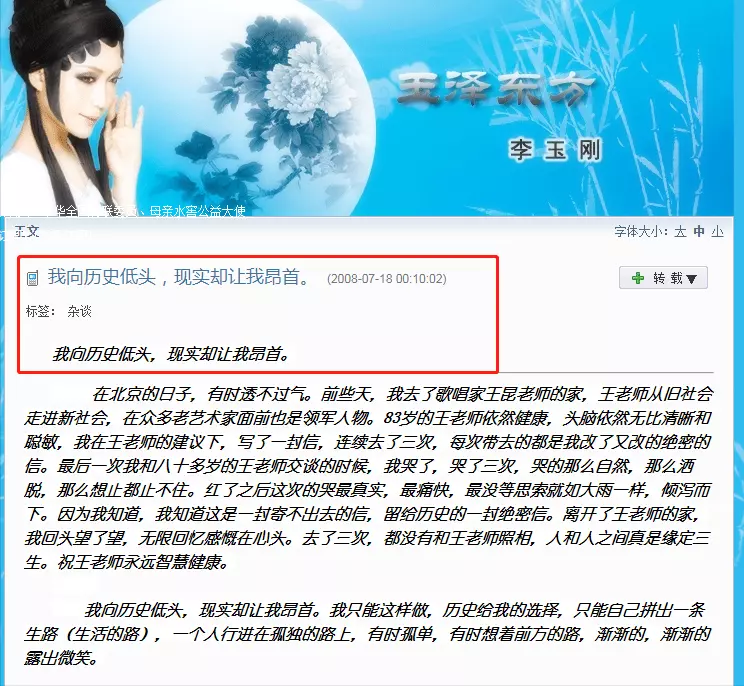但最终李玉刚始终都没有迈出那一步,还在博客中写下了“我向历史低头,现实却让我昂首”这样的话,无异于是在暗讽梅派以大欺小。