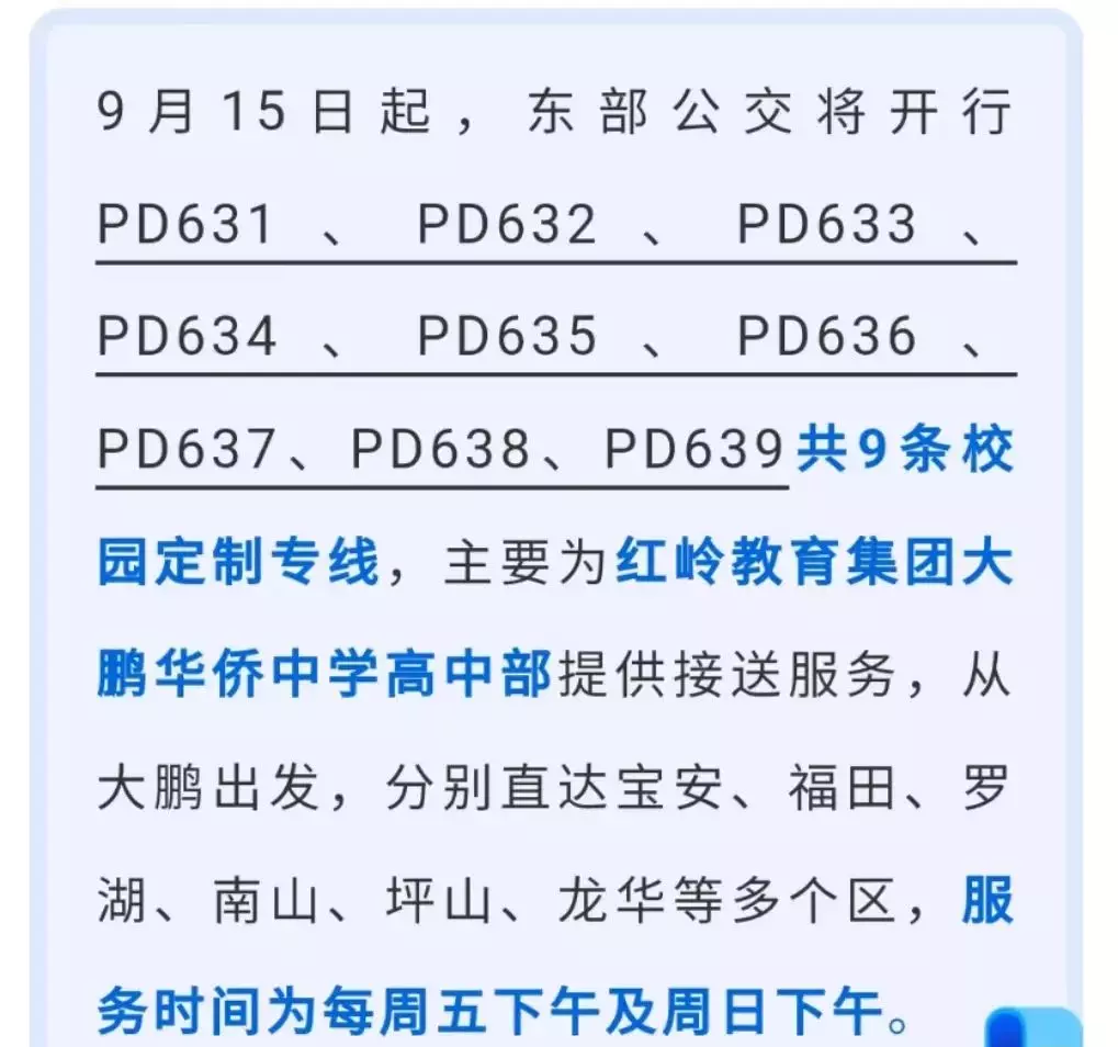 ● 大鹏:东部公交开行9条校园定制专线,主要为红岭教育集团大鹏华侨中学高中部提供接送服务。