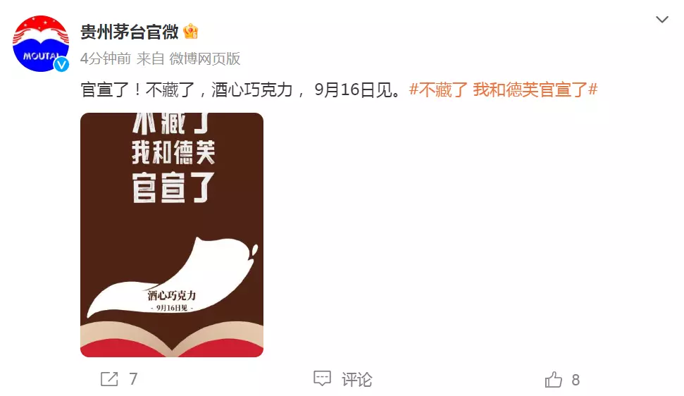 ● 9月14日,茅台发文官宣与德芙联名推出酒心巧克力,将于9月16日发布。经典酒心巧克力礼,盒2颗装定价35元/盒。