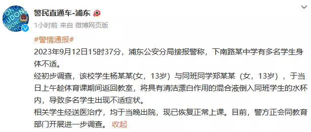 ● 9月14日,上海市公安局浦东分局官方微博发布一则警情通报,回应网传“上海一中学投毒事件”。