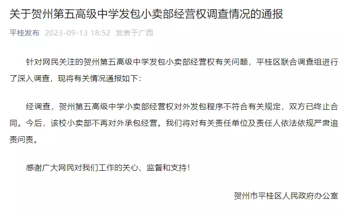 ● 广西通报贺州第五高级中学小卖部“天价”租金有关情况:已终止合同,该校小卖部不再对外承包经营。
