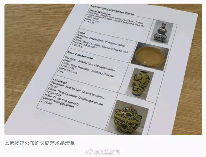 ● 近日,德国科隆的一家东亚艺术博物馆被盗,共有9件中国明清时期制造的花瓶、瓷盘和瓷罐等藏品失窃,价值超过100万欧元。