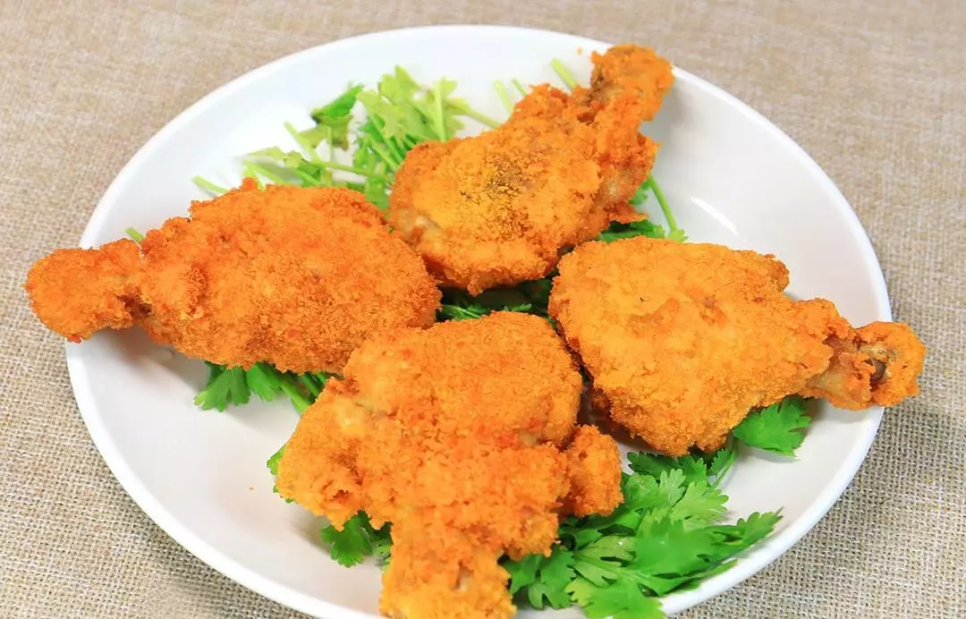 在鸡腿上面再裹一层面糊,粘上面包糠,放入锅中再炸一遍,这样既能把鸡腿炸透,又不会把外面的面包糠炸糊,经常翻面炸至金黄酥脆时,就能出锅装盘了。