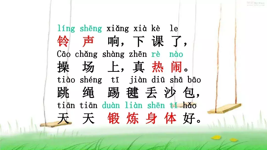 下课了(le)热闹(nao)这两个地方应读轻声。