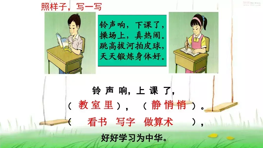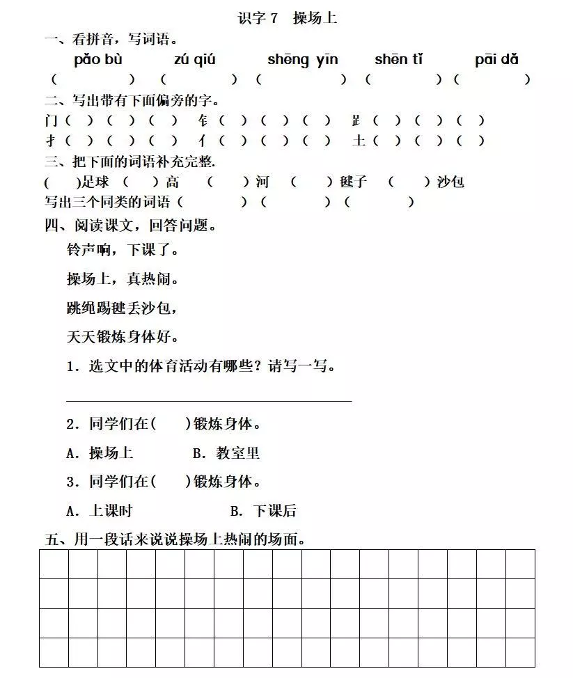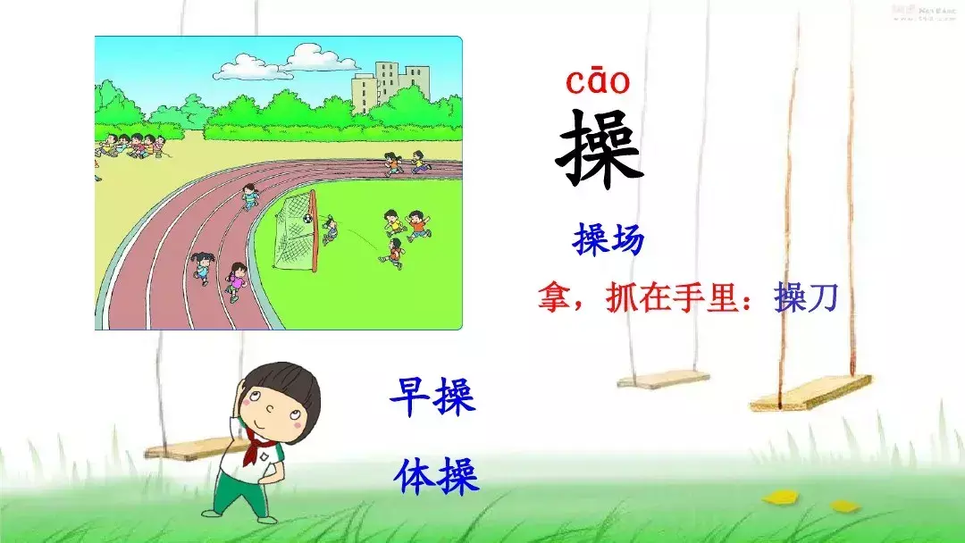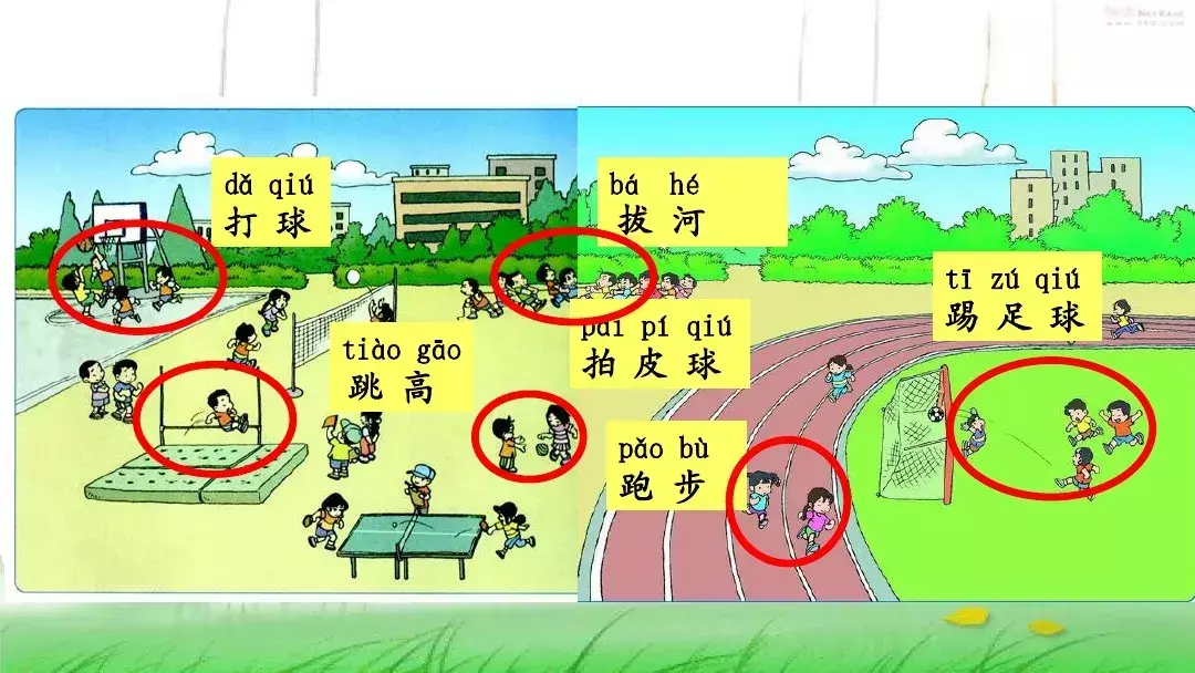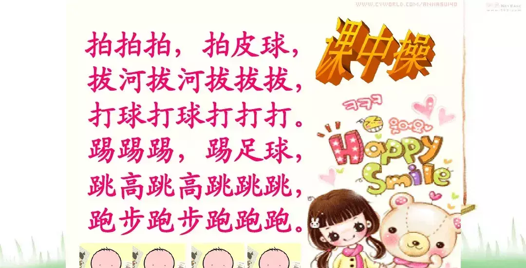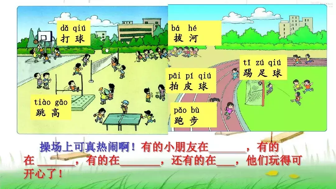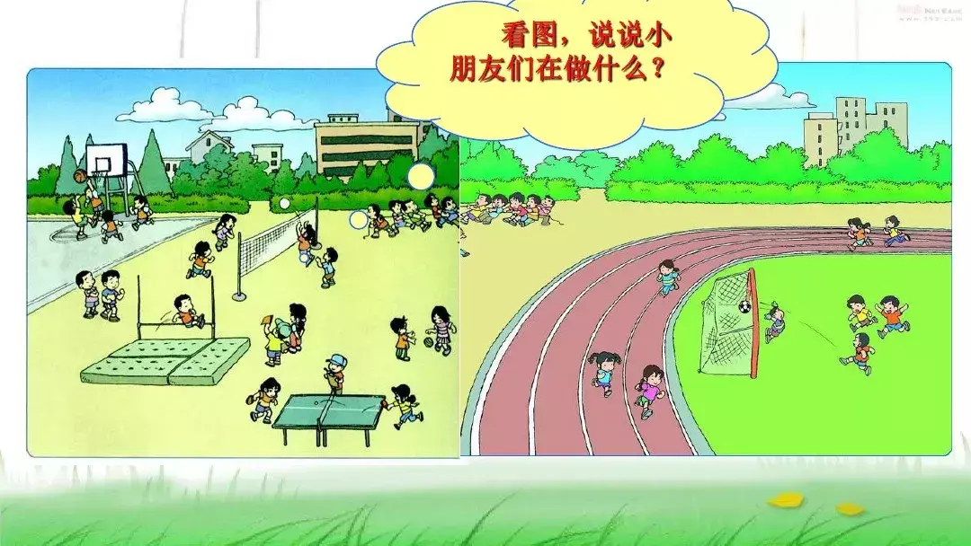 《操场上》以图文并茂的形式表现学生的校园生活,引导学生看图学词学句。儿歌描绘了下课后同学们在操场上活动的情景,告诉小朋友参加体育活动可以使我们的身体更强壮。