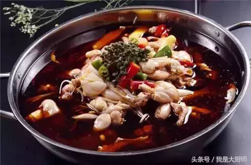 大嘴蛙(牛蛙)500克,底料1斤,鲜汤2斤,明油10克,四川特产魔芋片50克。
