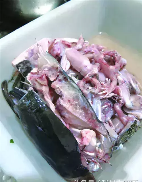 1、花鲢鱼头刷去表面鱼鳞,抠去鱼鳃,从鱼脑处劈开一分为二,加盐、料酒拌匀腌制5分钟去腥;美蛙剪去头部,去皮、去内脏,洗净血水,加盐、料酒拌匀腌制5分钟。