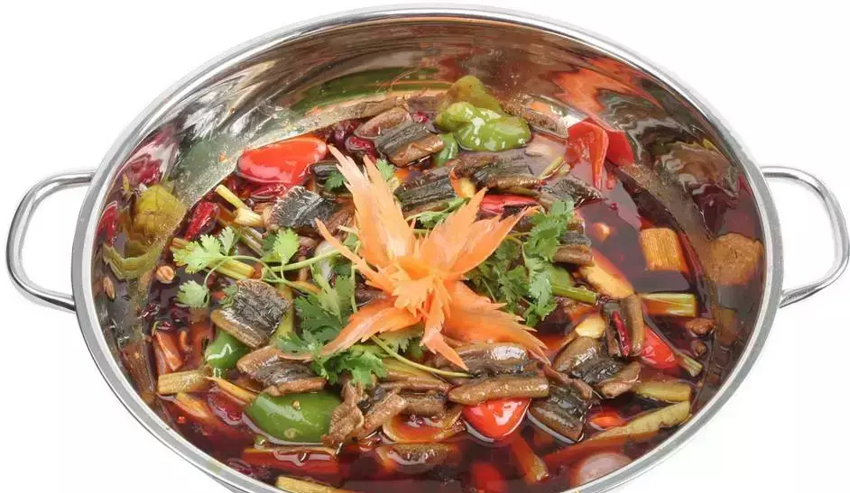 鳝鱼片1000克,毛肚500克,黄喉500克,牛肉44克,海带、藕片、豆腐皮、生菜各200克。