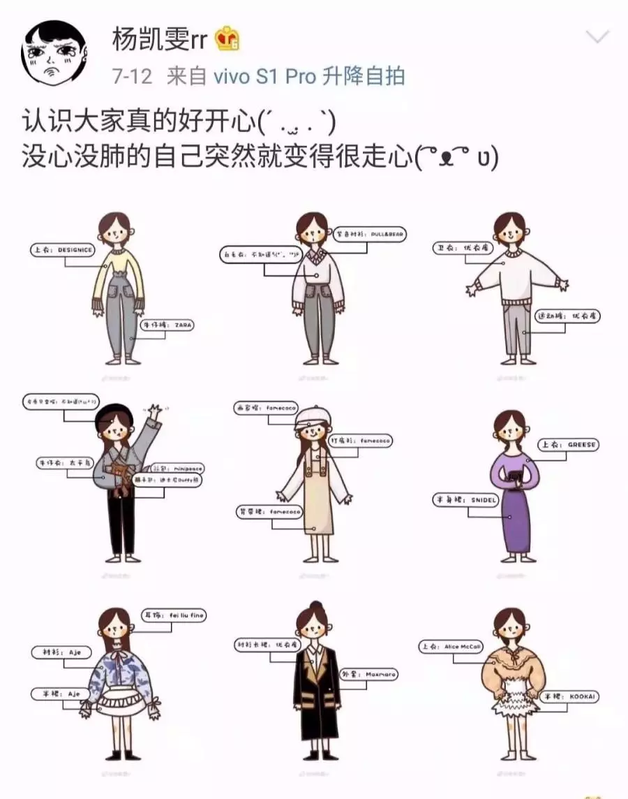 所以说能来这个节目的人没有一个是简单的,大家都很优秀。不过这一期杨凯雯的确很可爱,真实不做作,衣品也很好。同时被赵琦珺和威廉两个人看中。可爱的凯文还把自己的穿搭画出来还标出来牌子分享了给大家。