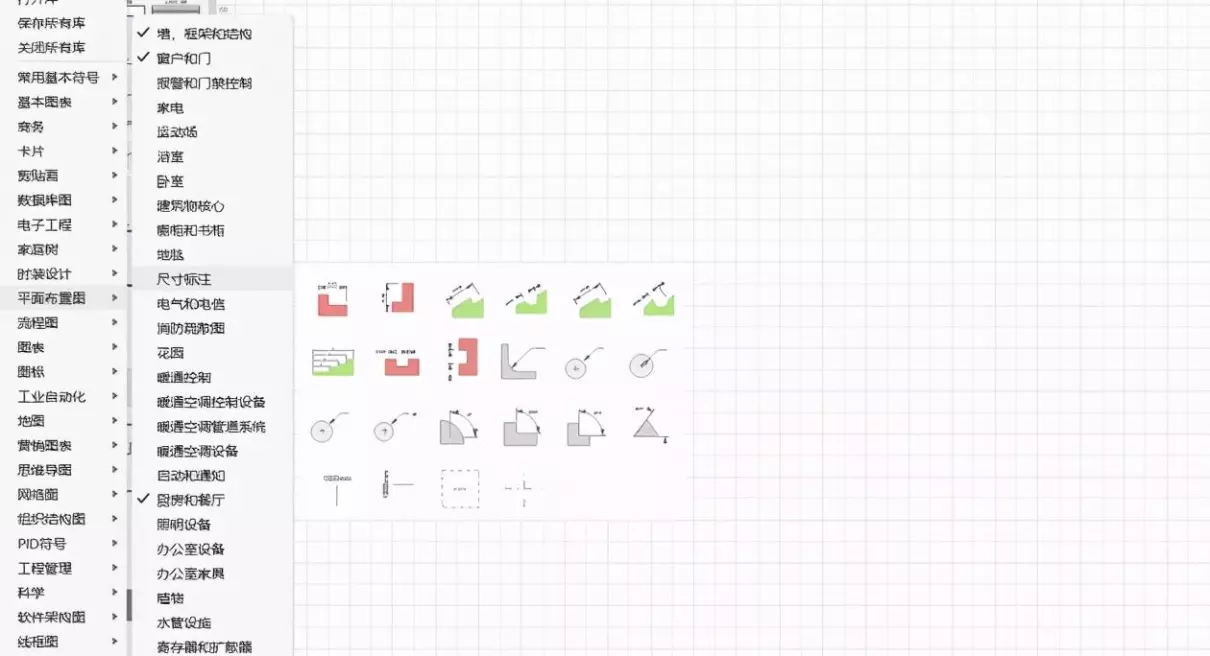 亿图中的建筑符号实在是太多了,笔者在这里就不一一介绍了,大家从下图感受一二即可,更多的还是由各位自行去亿图中了解吧。