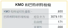 - KMO =0.8550.5,样本量足够,球形度检验,P =0.0000.05,符合球形度检验。结合两项指标,本例适合进行因子分析。