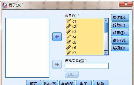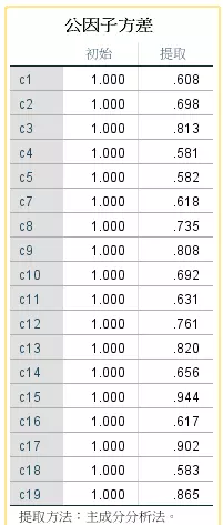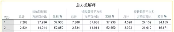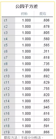 - 公因子方差:表示因子分析可提取该变量的多少变异量。一般来说,至少要大于0.45,由此可见C6选项可尝试剔除。
