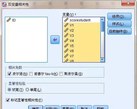 - 在本例中将29个变量和总分进行相关分析。相关分析方法选择皮尔逊,即默认分析方法