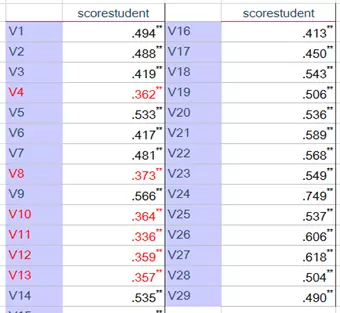 - 由上述结果可看出,V4/V8/V10/V11/V12/V13同总分的相关系数均小于0.4,可考虑删除再行测试