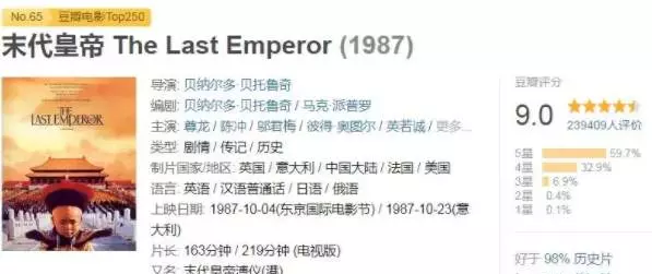 电影上映后好评不断,1988年,《末代皇帝》还获得了第60届奥斯卡最佳影片、最佳导演、最佳改编剧本等9项大奖,贝托鲁奇也借此登上了导演事业的巅峰。