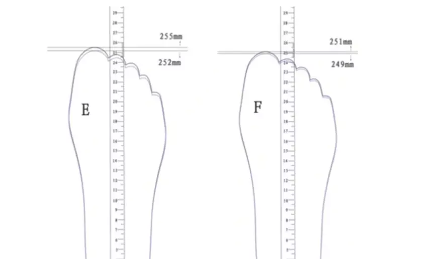 - 测量脚形宽度,数字记下,同一种鞋子往往有不同的宽度,中国尺码每个鞋号有五个胖瘦型,根据自己的尺寸选择出合适的型号