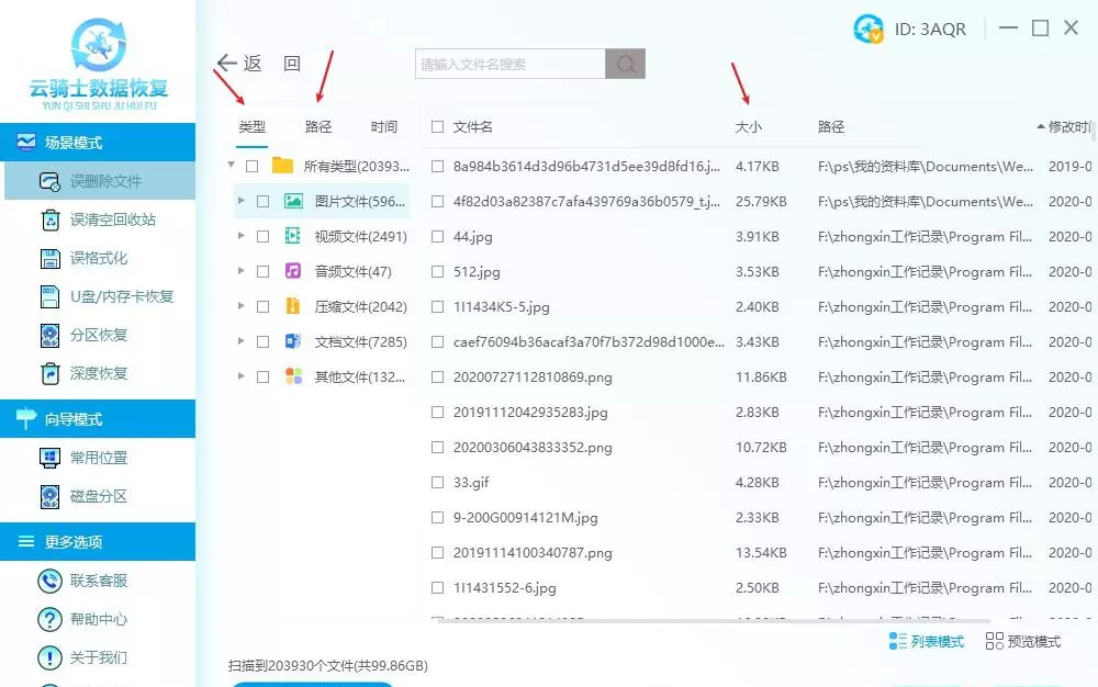 - 扫描结束以后,可根据路径方式快速查找,或者根据文件夹数据类型/大小等缩小查找范围。