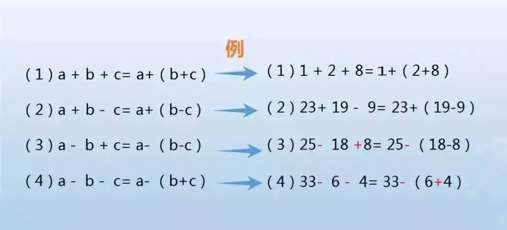 1.在加减运算中添括号时,括号前是加号,括号里不变号,括号前是减号,括号里要变号。