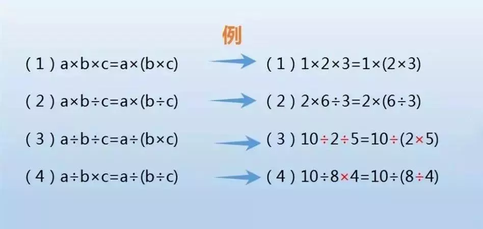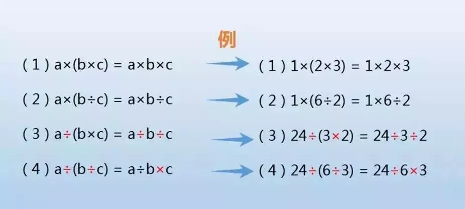 2.在乘除运算中去括号时,括号前是乘号,去掉括号不变号,括号前是除号,去掉括号要变号(原来括号里的乘,现在就要变为除;原来是除,现在就要变为乘。)。