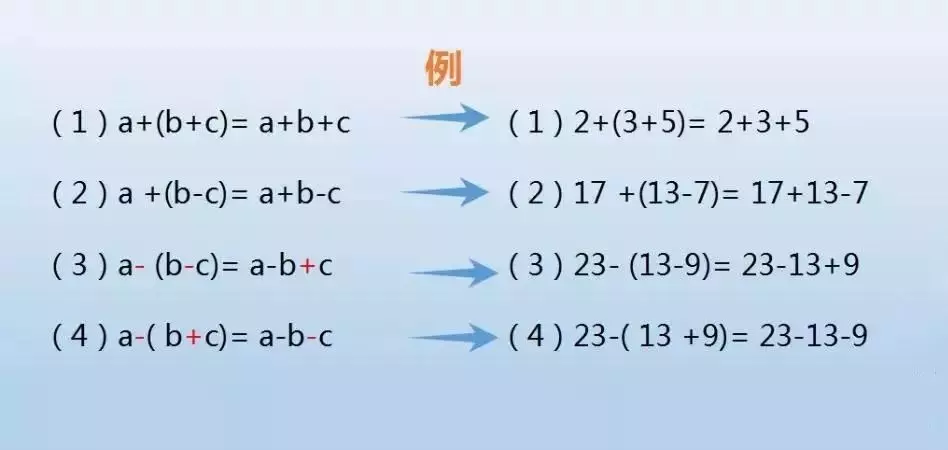 1.在加减运算中去括号时,括号前是加号,去掉括号不变号,括号前是减号,去掉括号要变号(原来括号里的加,现在要变为减;原来是减,现在就要变为加。)。