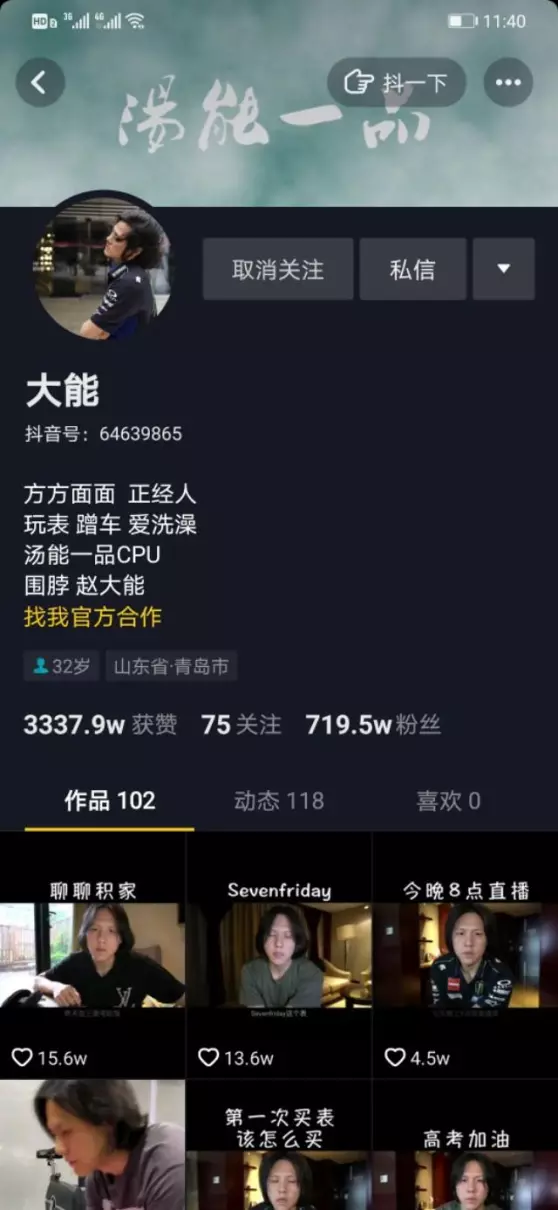 大能哥,作为短视频界的新晋红人,两个月粉丝已经七百多万了。大能哥主要是在短视频里讲表,只要评论点赞过万就启动机制,下期就讲什么内容。比如说,“去夜店戴什么表”“打王者荣耀带什么表”“出师表”“乘法口诀表”“工资表”,还有“洗澡”等等,网友的兴趣网友的梗成功被他get,他的粉丝量达到100万仅用了15天,粉丝突破600万仅用了38天。对于各种表大能哥是样样精通,说讲就讲。这都不算厉害的,最厉害的在于人家讲着讲着,几百万的表回身就去拿一块出来给你现场教学一番。这么神通广大的能哥到底是谁呢?怎么就成了新晋网红,迅速蹿红了呢?