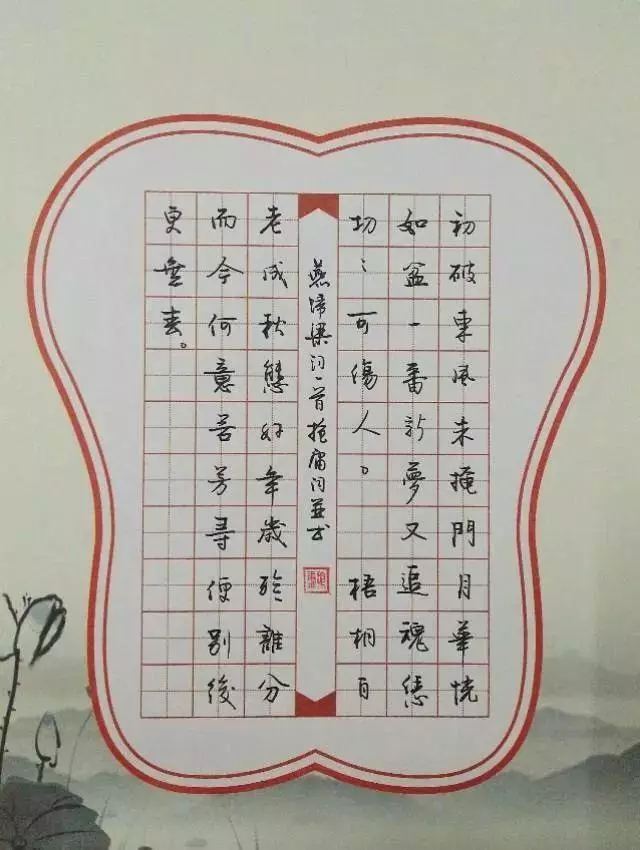 图中的这种纸型是60格的,而且一分为二,一边各30格。这种纸型最适合写旧体词,而且是专门写中调,比如临江仙、菩萨蛮、玉楼春等词牌。五体皆能用,句末可加标点。